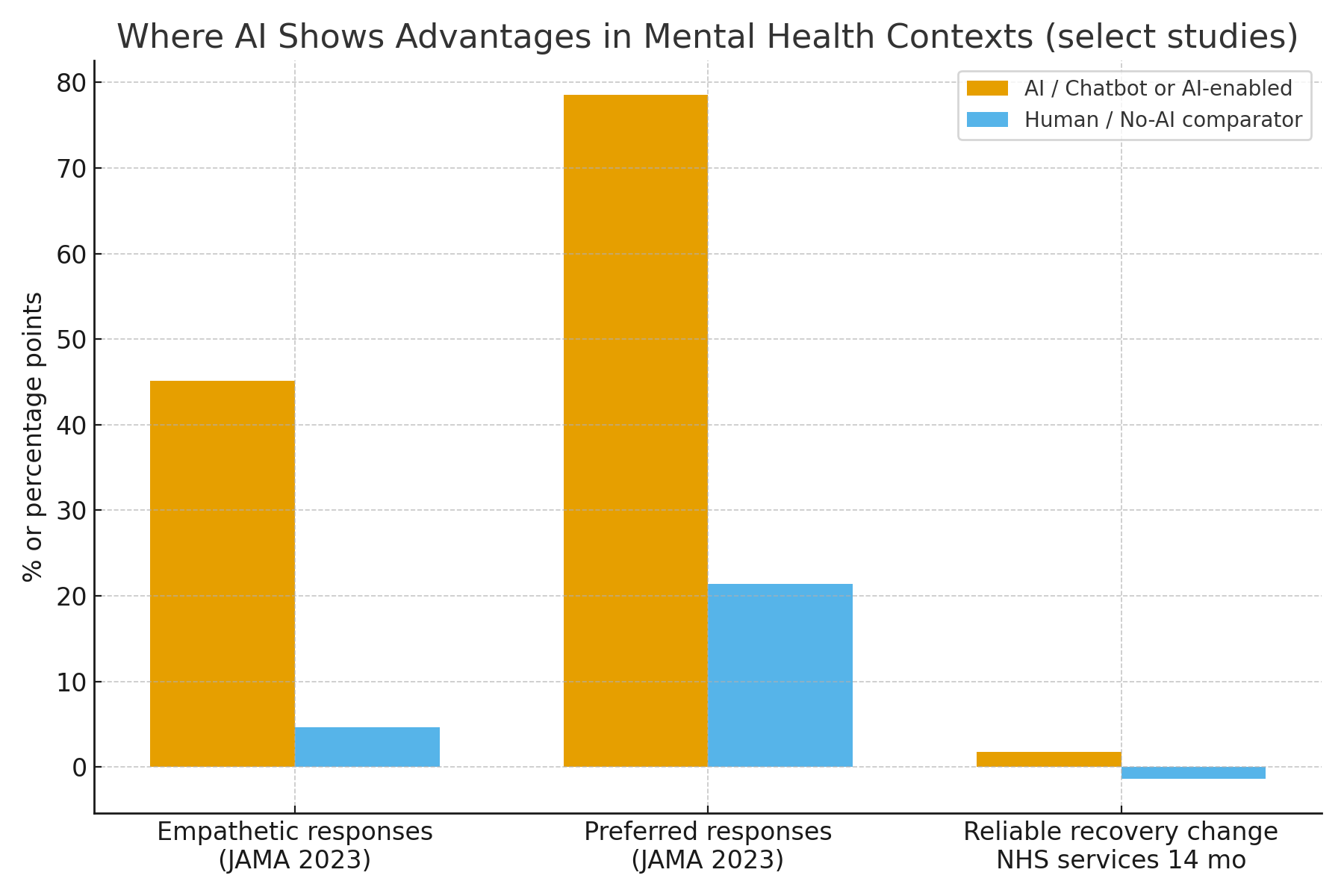 A BMJ Innovations study of 58,000+ NHS patients found services using AI intake tools achieved higher recovery rates while delivering care at >90% lower cost per additional recovery compared to adding traditional therapy sessions.